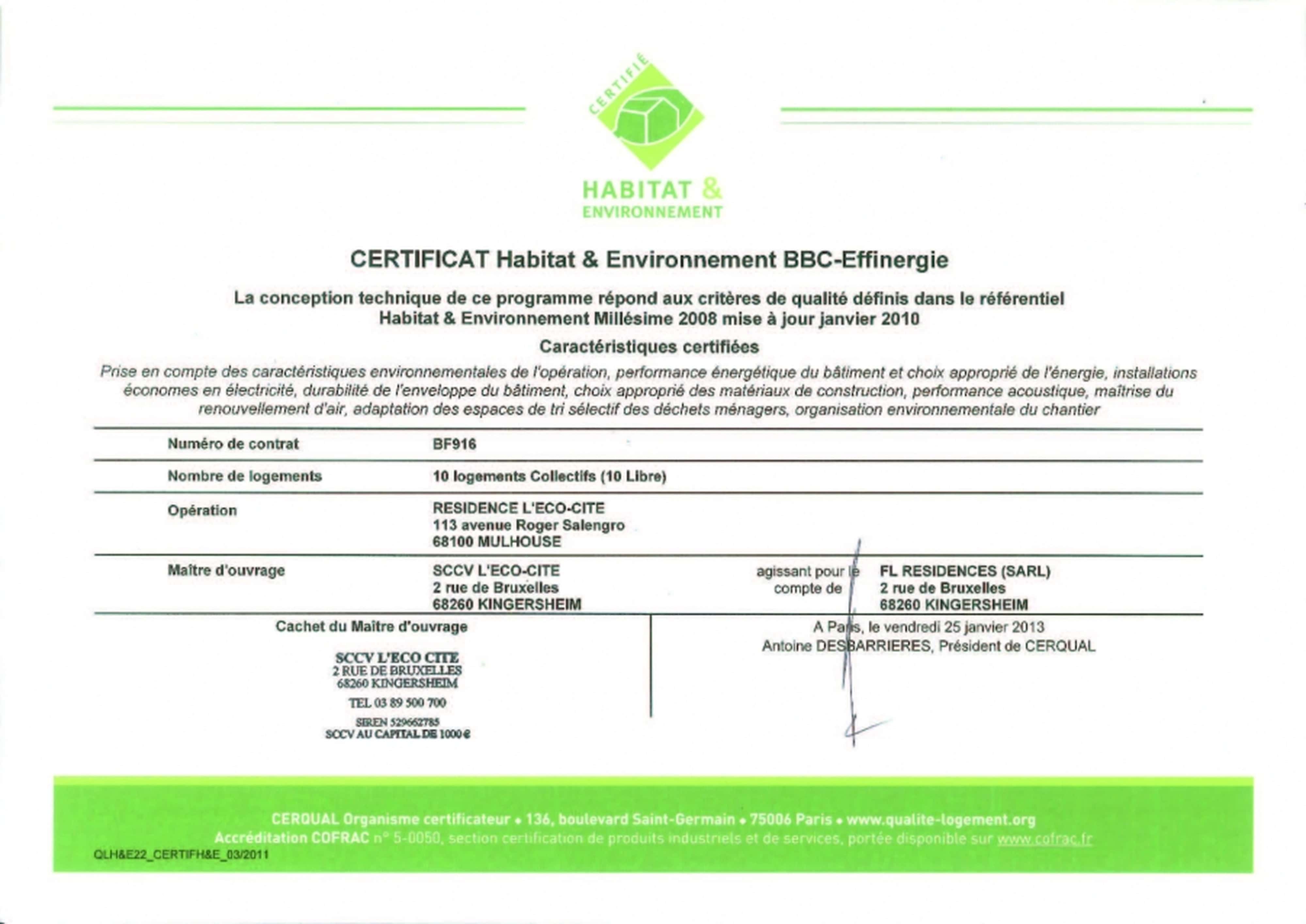 C'est après beaucoup de travail, que toute l'équipe de FL Résidences est heureuse de recevoir la Certification Habitat et Environnement BBC Effinergie délivrée par la CERQUAL.
