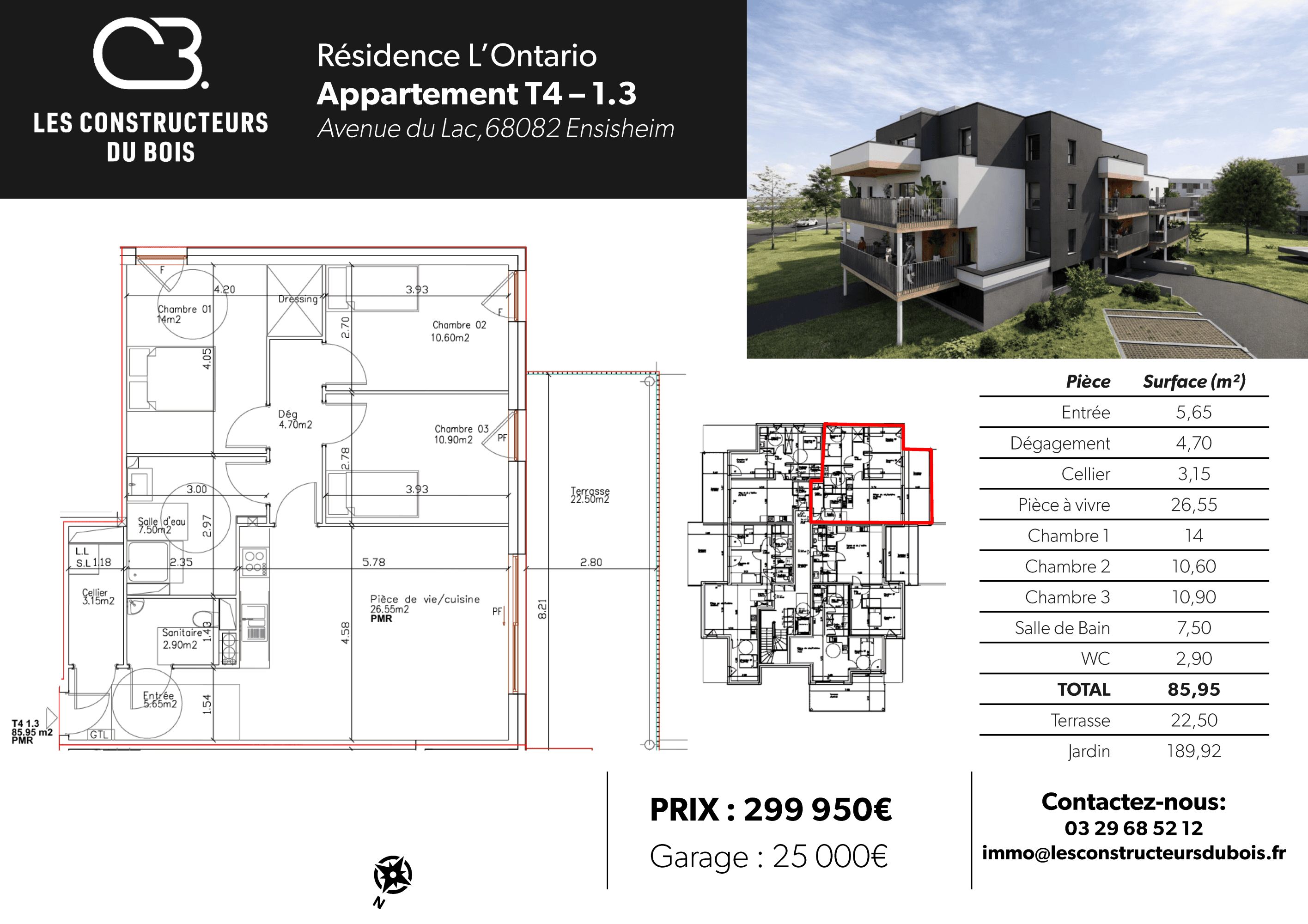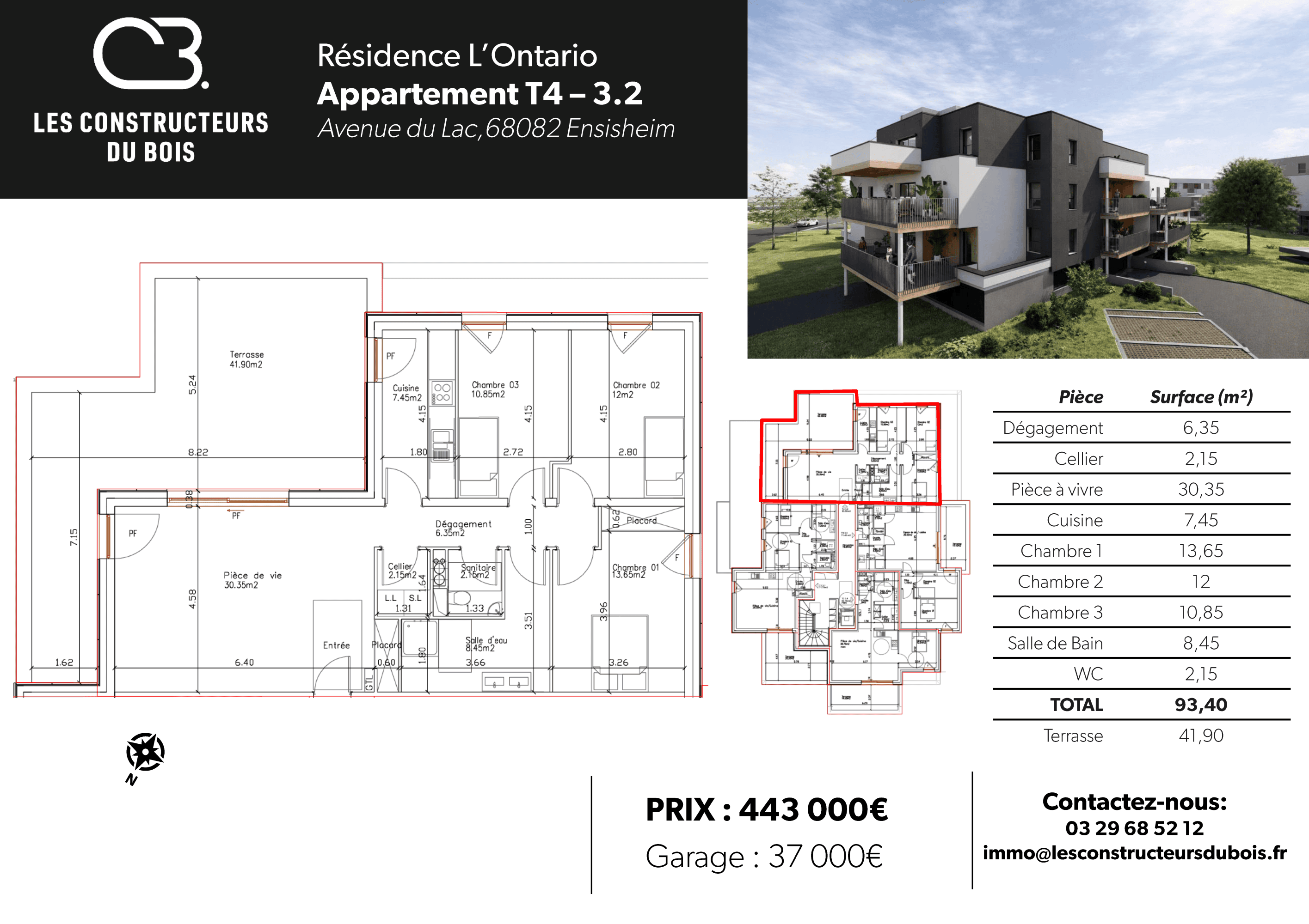 Au premier étage, ce beau 4 pièces possède une terrasse de 42m². Un garage en sous-sol de 37m² pour 2 voitures complète le logement.