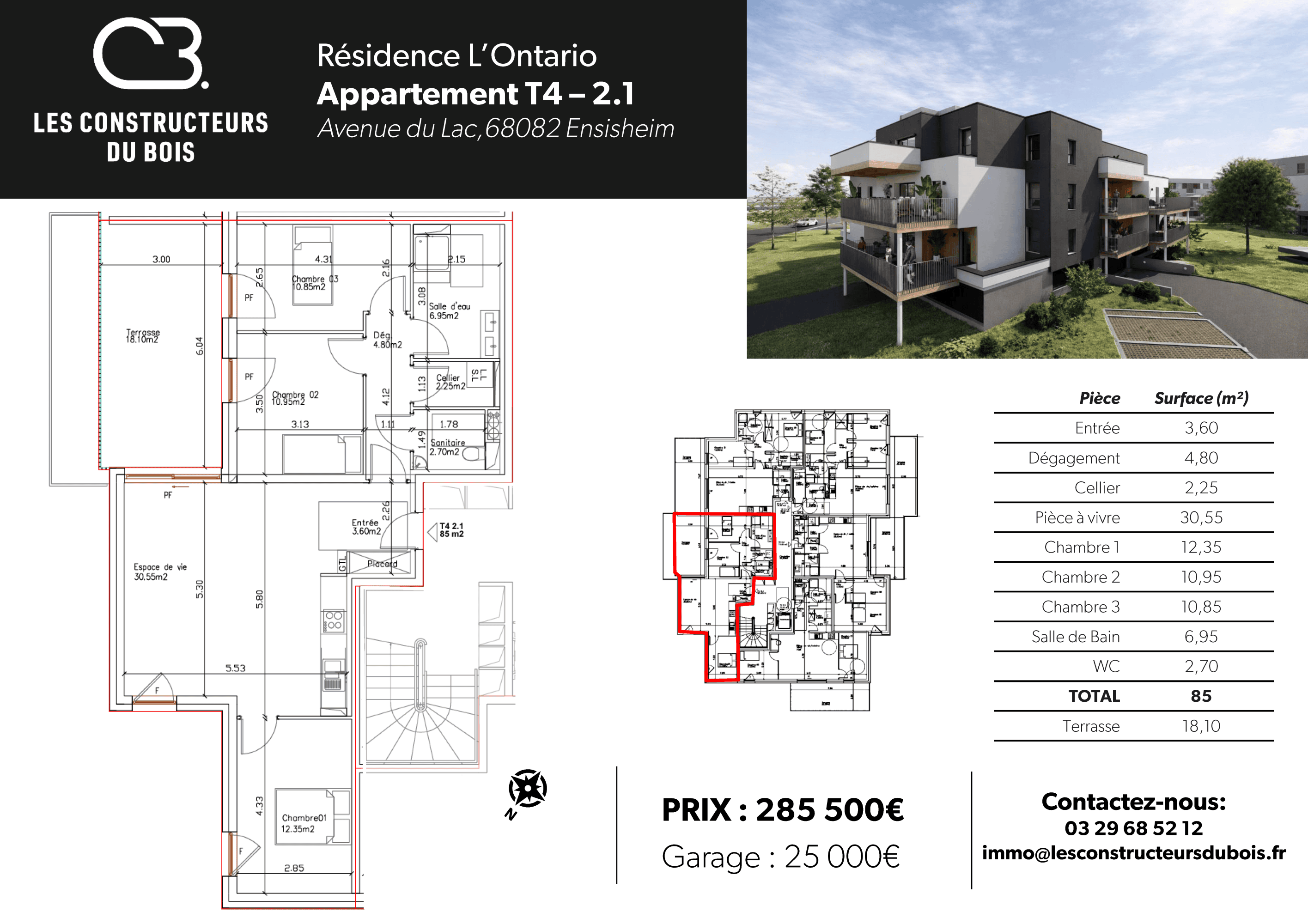 Au premier étage, ce beau 4 pièces possède une terrasse de 18m². Un garage en sous-sol pour 2 voitures complète le logement.