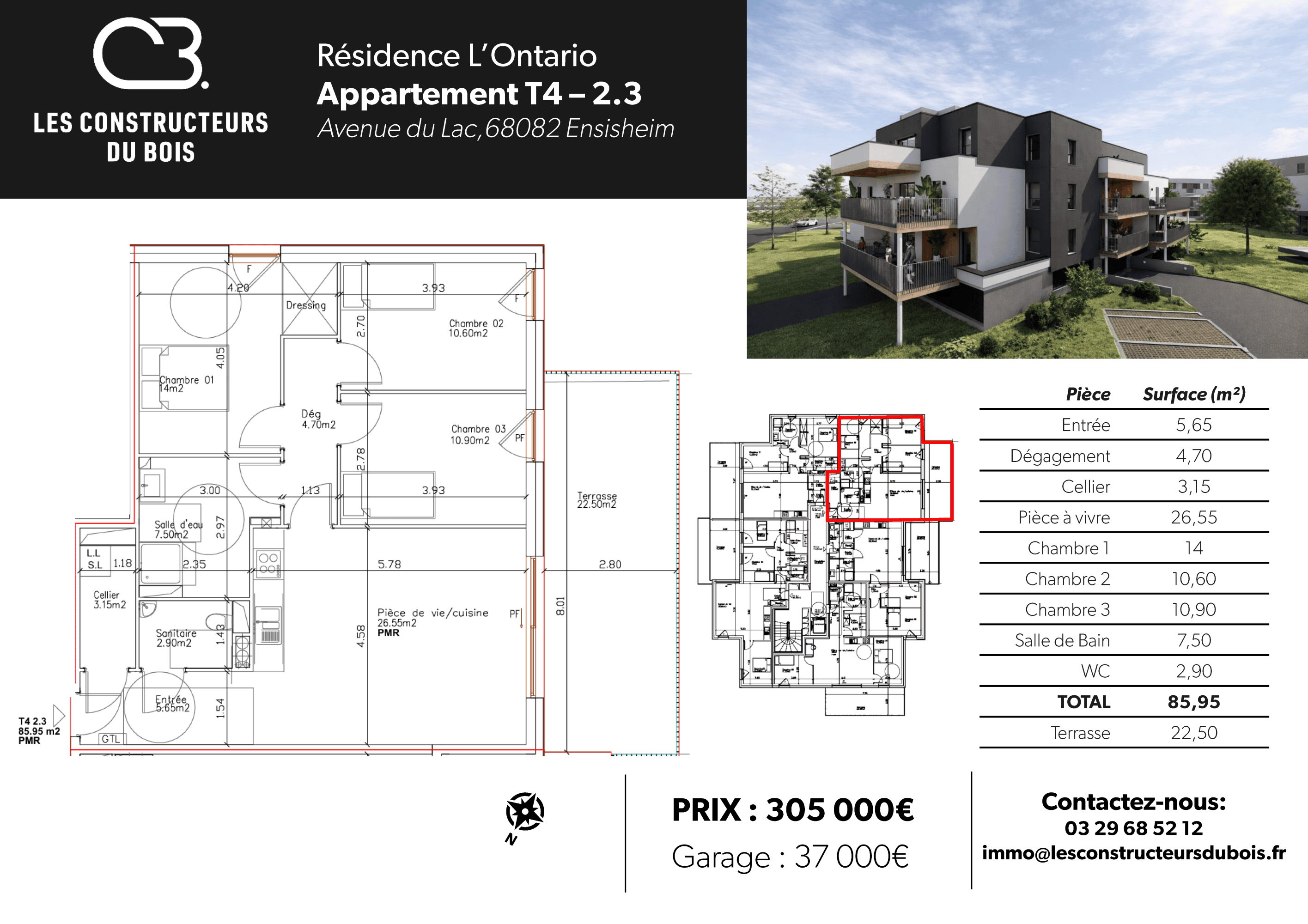 Au premier étage, ce beau 3 pièces possède une terrasse de 23m². Un garage en sous-sol de 37m² pour 2 voitures complète le logement.