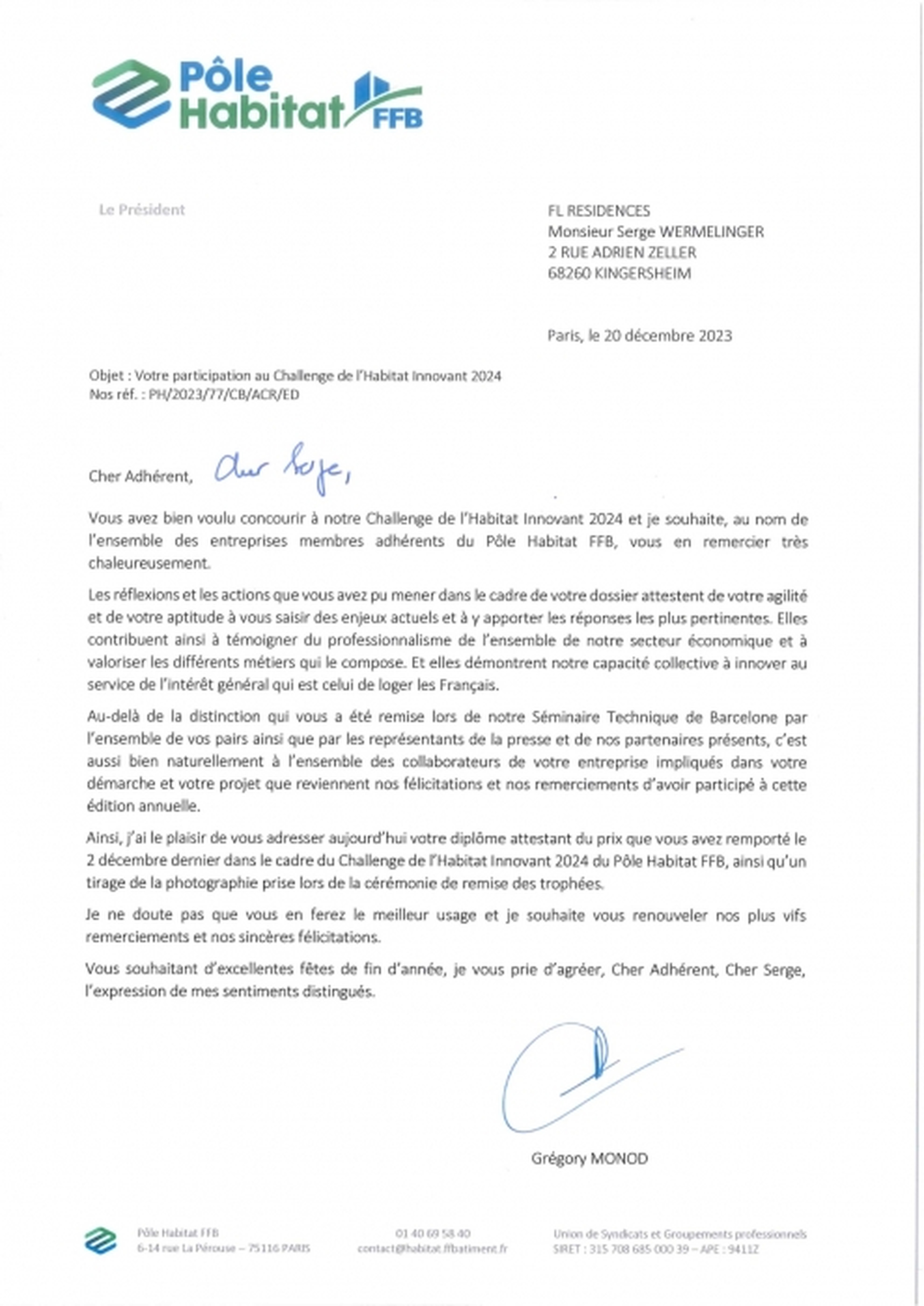 Vous avez bien voulu concourir à notre Challenge de l'Habitat Innovant 2024 et je souhaite, au nom de l'ensemble des entreprises membres adhérents du Pôle Habitat FFB, vous en remercier très chaleureusement.