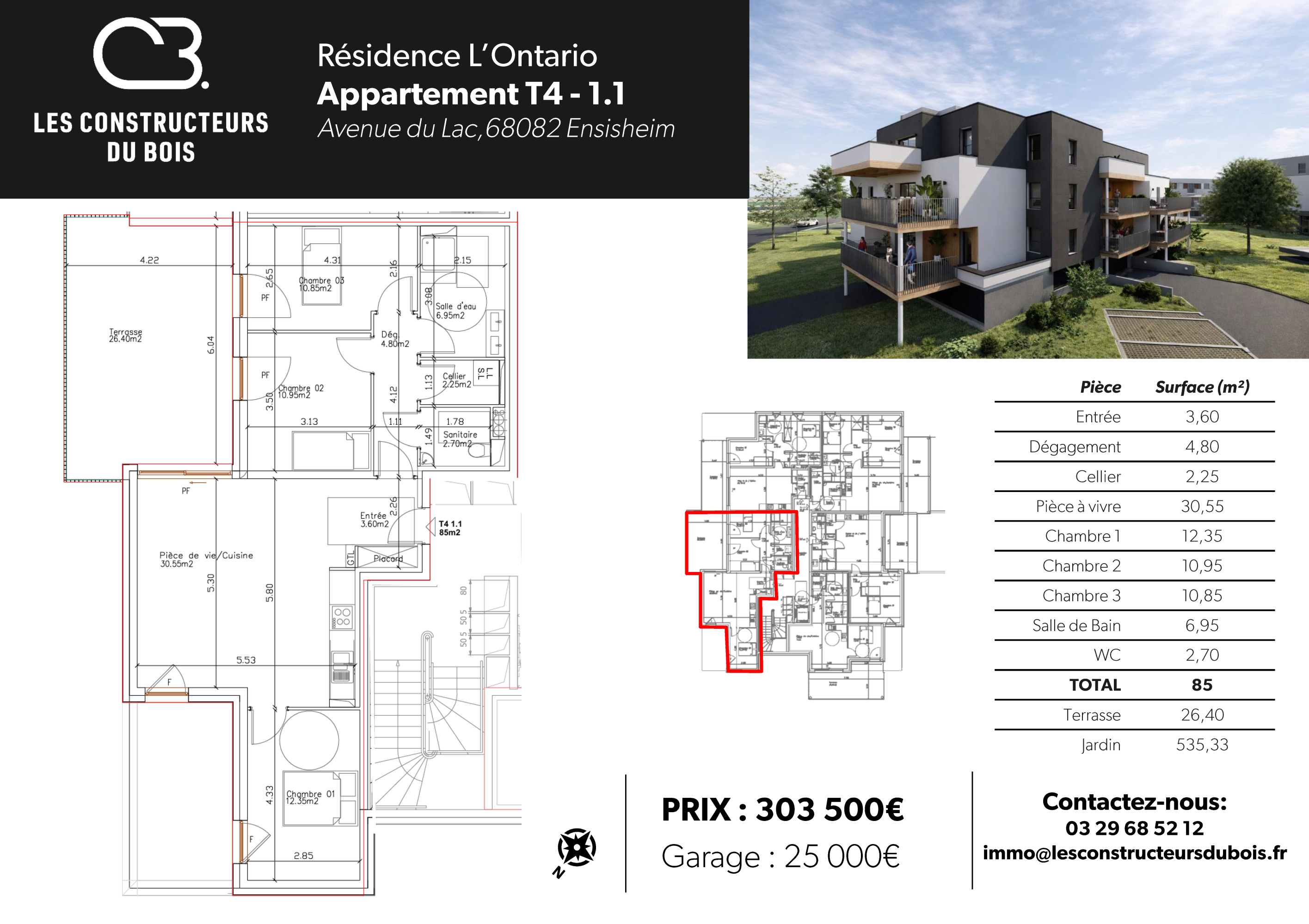 Au premier étage, ce beau 3 pièces possède une terrasse de 23m². Un garage en sous-sol de 37m² pour 2 voitures complète le logement.