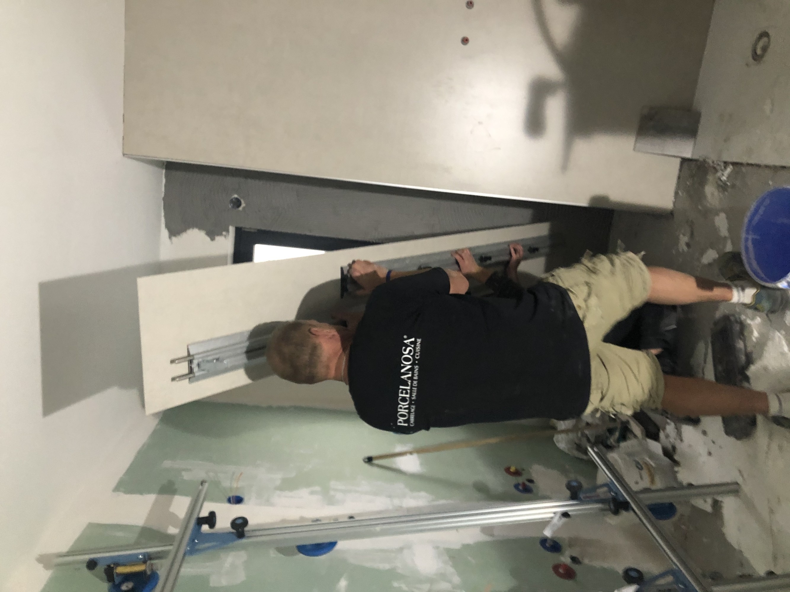 Notre maître carreleur à l'oeuvre pour de la pose de grands carreaux (2,5m)